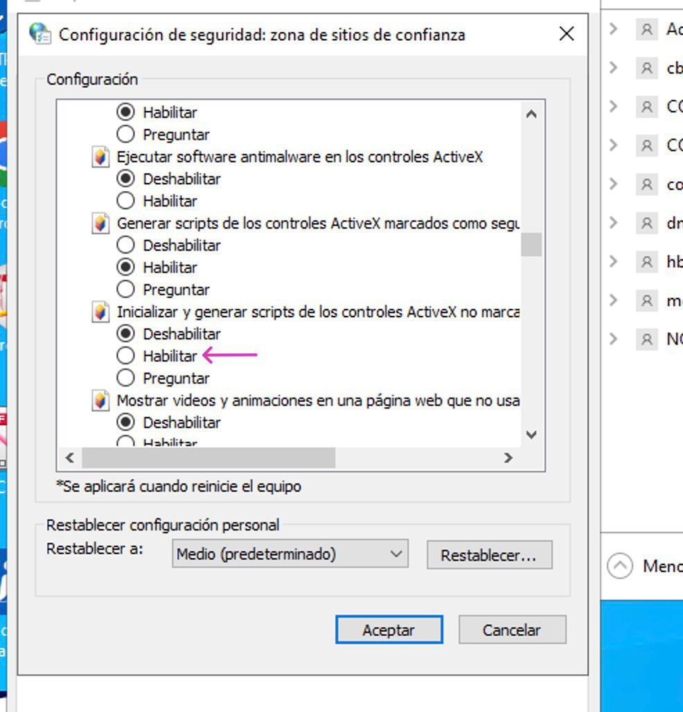 Dentro de sitios de confianza en el boton de Nivel personalizado se tiene que habilitar la opcion de inicializar y generar Scripts de los controles ActiveX.